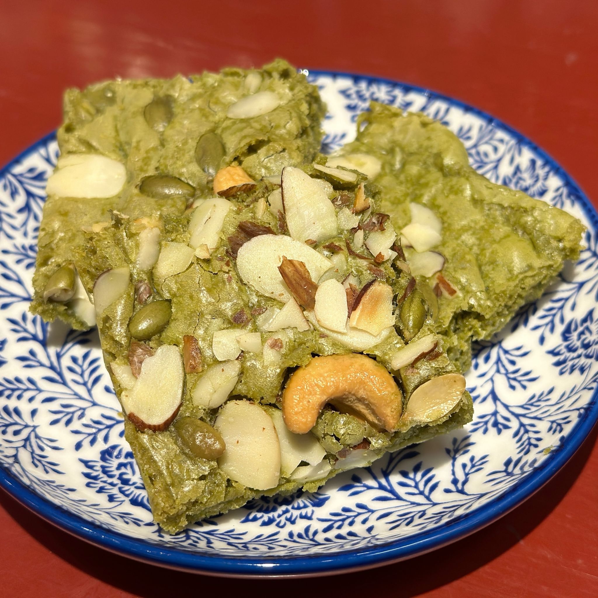 Chewy Matcha brownies, topped with cashew nut, sliced almond and pumpkin seeds